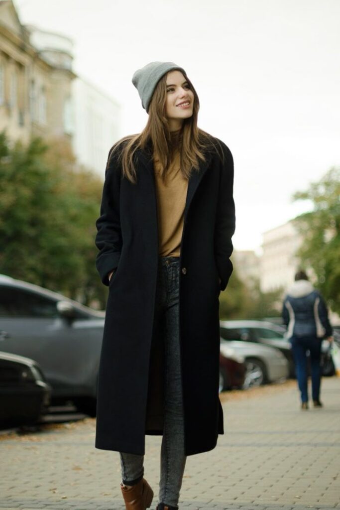 A pleated or A-line skirt paired with a cozy sweater and knee-high boots is the perfect mix of comfort and style. Throw on a trench coat or longline coat for that extra fall drama.