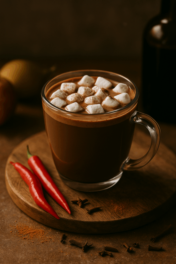 This is dessert and a drink in one—rich cocoa, a pinch of chili heat, and a splash of something strong. Top it with whipped cream and don’t skip the marshmallows. You deserve it.