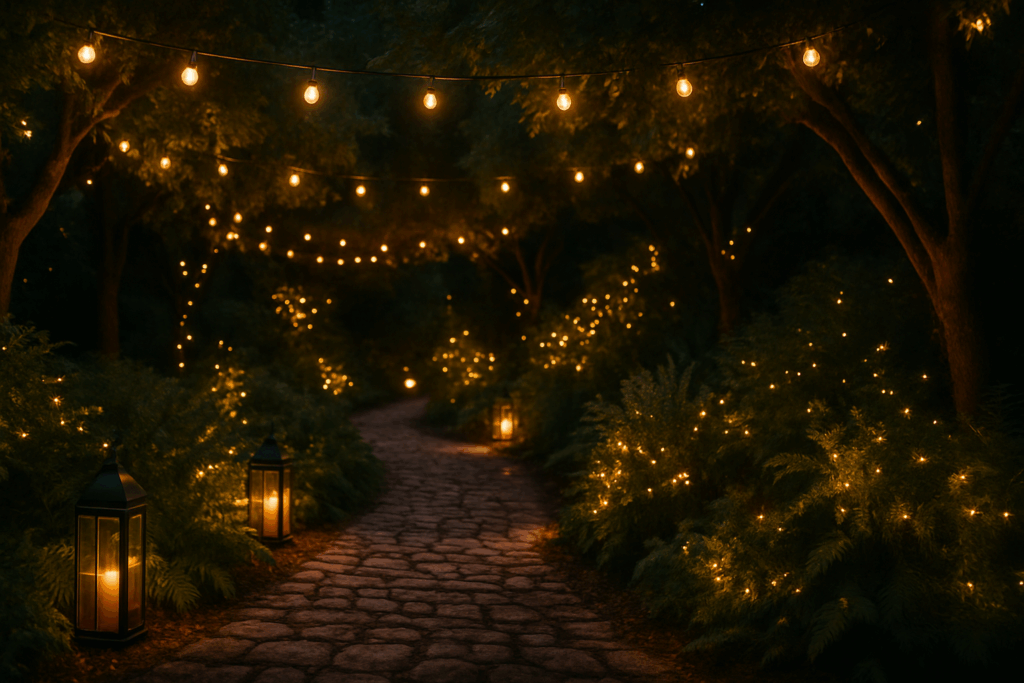 Lighting is what turns your average yard into a storybook setting. It’s not about bright spotlights or security lamps—it’s about soft, twinkling layers of light that create warmth, depth, and a hint of wonder.