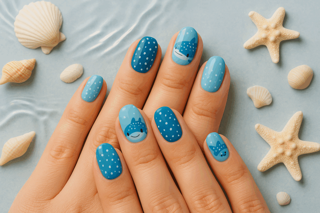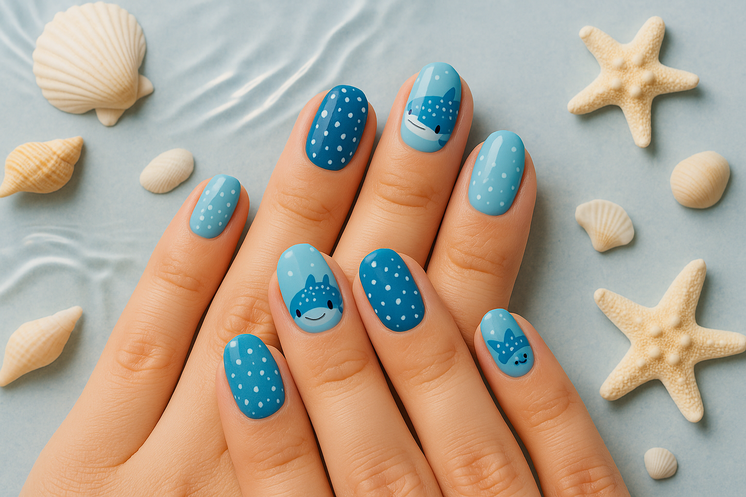 One or two nails featuring a full whale shark character (face, fins, and all!) — often done in soft grey-blue with a friendly smile.