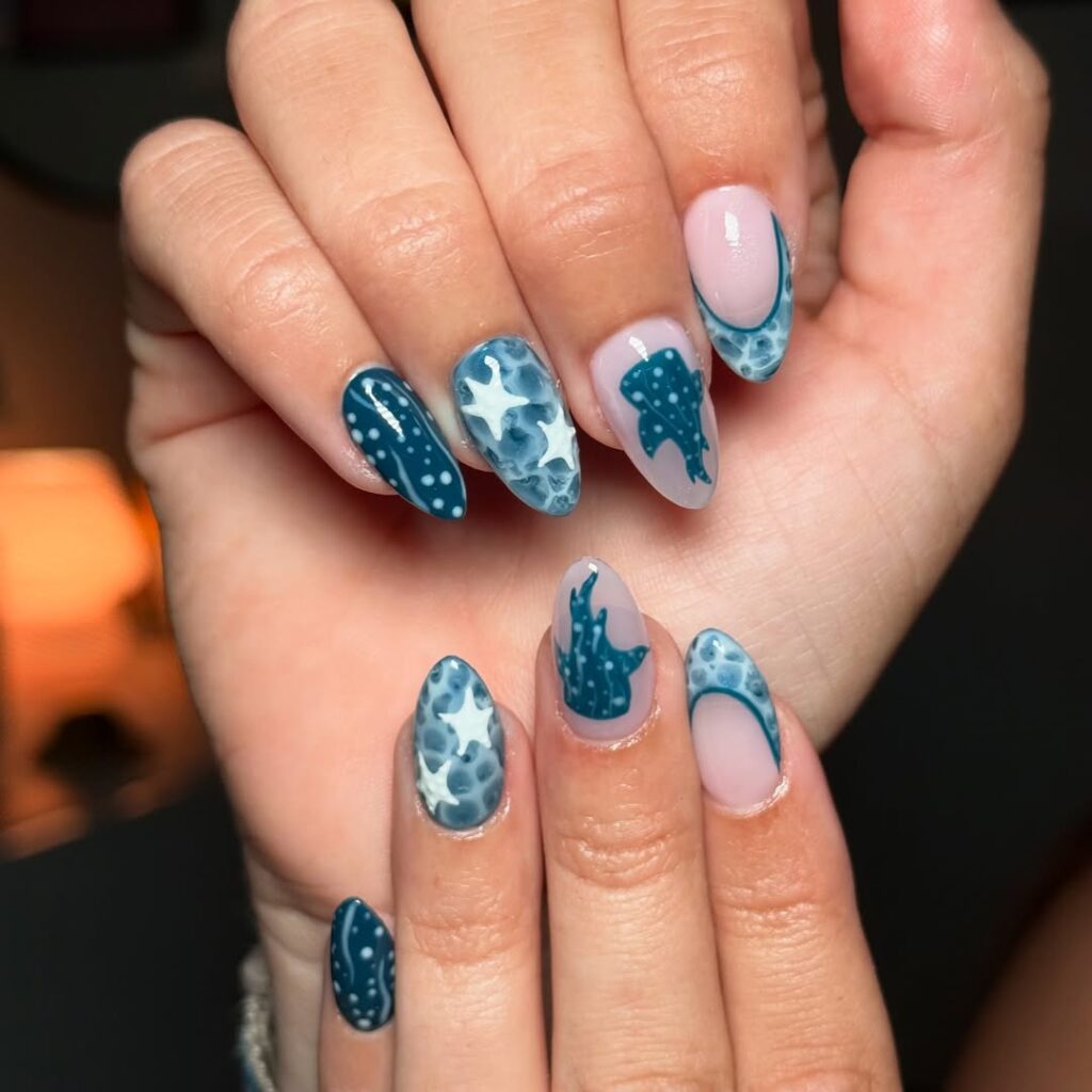 Whale shark nails are inspired by the gentle giants of the ocean. Think dreamy ocean-blue backgrounds, speckled patterns that mimic their distinctive white spots, and playful accents like fins, tails, or even tiny whale shark faces.